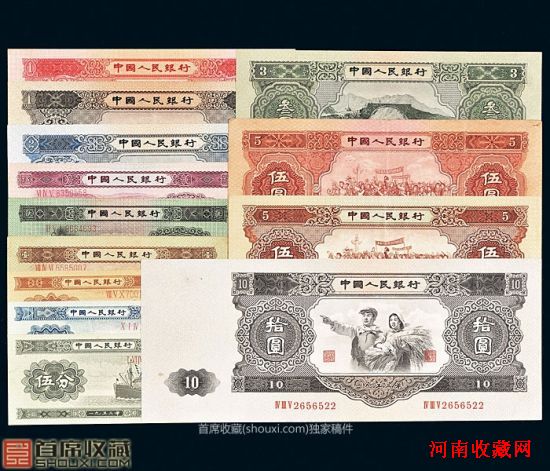 新中国部分,九五成至全新一版人民币壹仟圆运煤耕田30枚,其中有29枚连号。当然,纸钞部分,最重量级的是七成新一版人民币壹万圆牧马,作为新中国纸钞的顶级名誉品,估价为110万-150万。另一吸引人的拍品为二版人民币大全套,整体七五成至全新,拾圆为八五成新,估价18万-20万。此外,全新四枚连号第三版人民币1962年壹角(背绿水印)二枚连号,也是极为难得。