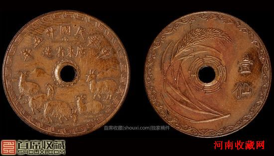 181枚机制铜币中,最引人关注的是PCGS-SP64BN民国25年广东省造五羊图壹仙铜币样币,铜质精良,设计独特,图案美观,深版铸造精美,品相完美无瑕。广东省会广州旧称五羊城,故此枚铜币正面以五只大尾绵羊作为主图案,凸显地域特色,一直以来都是收藏者热衷追求的目标,为民国铜元珍品。