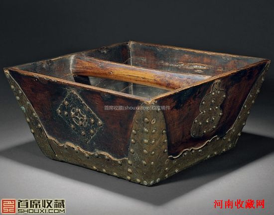 寥寥31金银器杂项,非常抢眼。清代铜镶包木质“金满斗”,葫芦形包铜一面印“乾隆乙卯六十年二月(1795年)金满斗”、另面印“周德堂置谢昭房立”字纹,四边转角及底边镶包铜件,四面贴有形铜片,所有铜件均满饰凸起的铜钉,间隙布满线条优美的卷草纹,制作精良,整器完好。