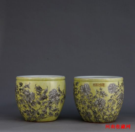 清光绪 “黄釉墨彩牡丹纹卷缸一对” H:46cm×2