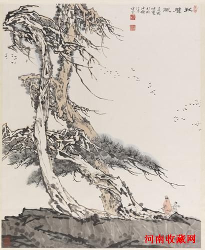 一翁一童相伴行于天高地远的秋色中,长空雁去,古木叶脱。画中的老翁,须发飘然,襟带倏然,稳如山岳,宛若就在眼前。此般风骨,何等清新宕逸、遒举俊发,透着一股仙风道骨之气。老翁衣纹以有力的线条勾勒而成,洒脱又大气。身后的小童执琴而立,衣纹的处理颇具动感。两棵巨松,顶天立地,立意高远。作者从大处着意、细处着笔,浓重的墨色与雄健老辣的笔法,给人以坚不可摧的力量感,营造了旷达的境界……(文/侯悦)