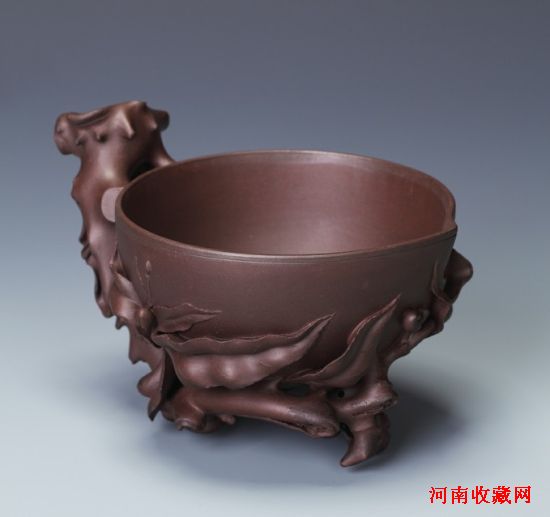 汪先生的此件圣思桃杯力作,著录于《紫韵雅玩》第269页。其外形似半个仙桃,并有枝叶相连,似刚从树下连枝摘下的仙桃。以苍劲的桃枝作把手,一枝三叶、长在枝端的三棵小桃子为基座,整个杯体上塑有老嫩桃叶数枚、大小不一的桃子、绽放及半开含蓄的桃花、花蕾,参差扶疏,形体各异,叶脉清晰,花蕊精细,婀娜多姿,技艺卓绝。伸展弯曲的叶片、桃枝末端及三个小桃构成了三个支撑点,令桃杯稳立桌面。杯口若桃,桃嘴作流,口沿及内壁光洁明润,整杯色呈深紫,泥质温润细腻,令人爱不释手,杯侧钤印“寅仙”阳文一枚。整体观之,心生“半桃可知江南味,紫砂艺苑大乾坤”之感慨!读器遐思,宛若品读一幅立体的江南工笔画,精巧细腻的风物图。