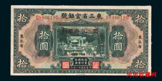 “大同元年(1932年)满洲中央银行改造券拾圆”(正面)