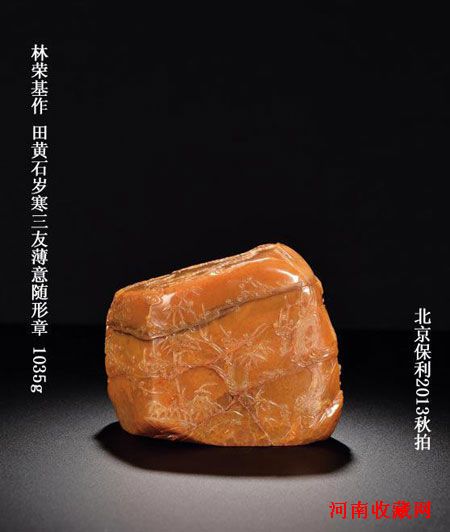 细数秋拍下半场各印石专场,寿山石俱为核心拍品,其中不乏田黄重器,特别是保利拍卖“雅印聚珍”专场一枚重达1035g的田黄石岁寒三友薄意随形章世所罕见,堪称国内印石拍卖史上最大的田黄,在各地巡展期间已经引发业界的广泛关注,因其价值不凡,目前保利尚未公布她的起拍价,至今仍估价待询,令藏家备感期待。“雅印聚珍”专场除了这枚巨田之外,还集结了一批重量百克以上的田黄珍品,不仅品质上佳,亦有不少出于名家之手;而百克以内的田黄珍品亦有精绝之品,像重51克的林寿煁作田黄石留皮松下高士随形章、重40克的林清卿作田黄石幽崖灵菊章等拍品皆为工材并重的精品。另外,匡时“方寸乾坤”专场的田黄拍品也有诸多看点,林清卿作寿山田黄石《芦雁图》薄意摆件最为精彩,为匡时重推拍品。