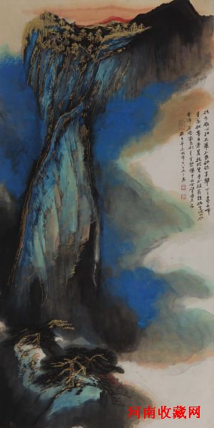 何海霞的作品中,小青绿、大青绿、金碧、泼彩、泼墨和水墨浅绛,墨彩交融,天衣无缝,而且相得益彰,形成强烈的对比与和谐的统一。此幅《华山日出》,以泼彩勾金之法描绘了华山日出的壮丽景象,先生以“华山一奇”华山日出风光获得契机,不仅构图严谨,笔墨雄健浑厚,深得大千真传。何海霞一生八上华山,画的最多的也是西岳华山,他笔下的华山多为平头,变幻莫测,气象万千,巍然屹立,雄姿英发。从思想境界,审美情趣或绘画语言上都体现了何海霞的胆略与力量、成就与辉煌。