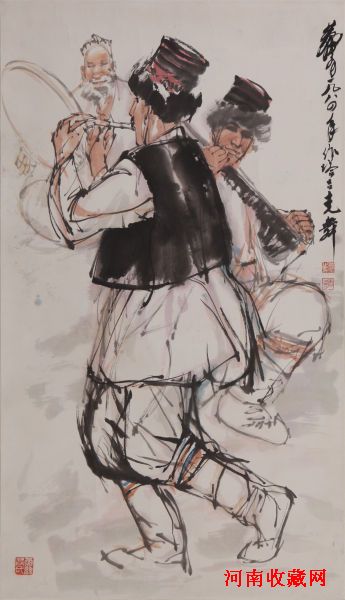 黄胄的笔墨长于叙事,长于情节性描绘,在他的画面娓娓道来的情境中,象征性的意味和纯粹的笔墨情趣分外动人。画上维吾尔族小伙子吹奏着鹰骨笛翩翩起舞,老汉一个打着手鼓,一个弹奏着冬不拉,陶醉在音乐和曼妙的舞姿中,好一副喜庆的形象。老人的动态捕捉的特别到位,一屈一伸,一倾一侧,脚步的姿势轻盈欢快,和小伙子形成了完美的呼应。整体感觉和细节刻画均有独到之处,表现出黄胄在人物刻画上的深厚功力。