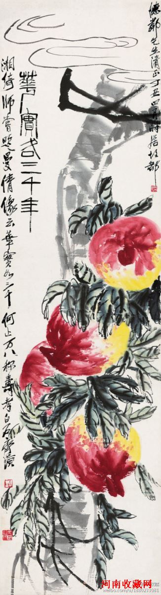 这幅寿桃画面章法生动,下幅一棵粗壮的桃树,上方一抹缭绕的云气,再加之左侧的篆书题跋,搭配巧妙,疏密有致,既描绘出鲜艳的桃子,又烘托出仙境的氛围,且通过题跋的环绕使画面具有一种装饰性。画法上,硕大的桃实直接以没骨法画出,笔尖用极重的洋红,笔根水份饱满,再以藤黄点染,墨色淋漓尽致,表现出桃实娇艳的特质;叶子以淡色画出,後用浓墨勾叶筋,笔法率意,与桃实构成冷与暖,粗与细的对比;树干以淡墨写出,造型粗简,使其不喧宾夺主。整幅布局生动,变化多端,造型简约,笔墨粗犷朴拙,色彩鲜艳亮丽,应是齐白石创作盛年的一幅佳作。
