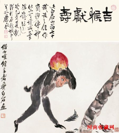此幅佳作,齐白石用率真的手法,于桃树下一只灵猴手里捧起鲜艳无比、硕大水灵、香气馥郁的蟠桃,形象动作极富童真,意思更有趣味——“寿且贵”。斜穿画面一段桃树枝干提示出桃树,给画面带来生意,使画面变得生动活泼起来,巧妙的构图表现齐白石匠心独韵的意趣。属于他画寿桃作品中的精品。