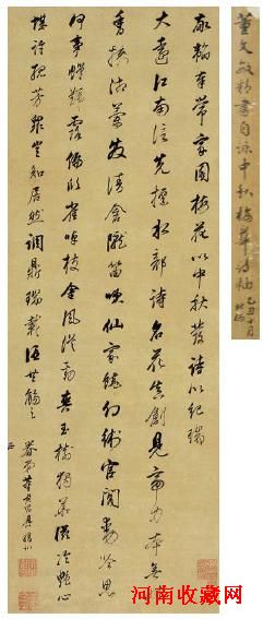 与绘画相比,书法技术的训练,更依赖于对传统经典的研习。董其昌这段自述,显然只是某个时期的说法,其实他的取法更远远不止于此。但他那博采众长而自成一家的造诣,则正是在这种不断的摸索中达到的。史家论董其昌书法,以其行书以“二王”为宗,又得力于颜真卿、米芾、杨凝式及赵孟頫,圆转生秀,萧散自然,于诸体中造诣最高,此轴行书咏《梅花诗》即可见一斑。