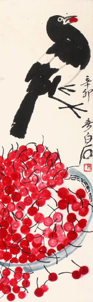齐白石喜画樱桃,曾题:“若教点上佳人口,言事言情总断魂”。读之俏皮,隽永,充满对人间对美好的人与事的关爱。齐白石善于将生活中最普通、最平常、最喜闻乐见的东西用画笔表现出来,通过他的表现,把习以为常的东西升华为雅致,使得平常的事物焕发出艺术魅力。