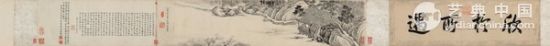 本幅画作为乾隆帝临唐寅绘制而成。唐寅赋性舒朗,放浪不羁,初师沈周,后学周臣;远宗李唐,刘松年,近师“元四家”;其画行笔秀润,缜密而有韵度,注重美感上的井然有序。此幅画面气息平旷天然,淡逸高雅。显然是唐寅洗练保守画风的上乘之作。画中景物多置於卷右处,在树石、溪流、台阁层层包裹中,一位文人贤士正在从容的作画赋诗,身边书童随待在侧。卷左侧将画面意境展开,似无边际,此画作平远之景,少皴擦晕染,笔简而意远,远处的竹林以墨色的干湿浅淡变化营造出怡人而又十分理想化的传统文人所追求的的意境。