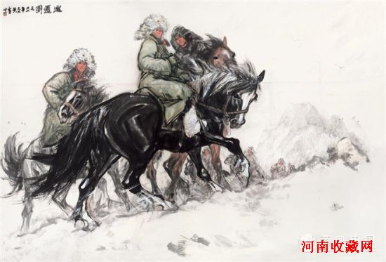本幅画以仰视角度突出表现了几个巡逻军人骑着高头大马行进在风雪弥漫的荒原上的情景,构图饱满,色彩厚重,在浑莽的视觉中蕴含着一种巨大的张力,相较于1958年的《巡逻图》更为深远老辣,空间感的处理更成熟,整幅传达出一种波澜壮阔、扣人心扉的气魄。他的造型能力、用笔,他的身体状况,都在这张画上表现出来,这是他高峰期的代表作之一,也是迄今我们在市场能够看到的黄胄作品中,尺幅最大的一件。
