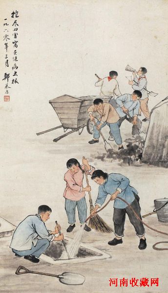 款识:挖尽四害窝,灭绝病虫根。一九六零年三月,郑慕康。