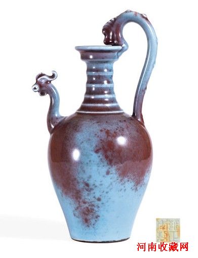 本次泓盛秋拍的这件仿钧釉龙柄凤首壶,即为上述第三类雍正仿钧瓷,来源于海外重要藏家。洗口,细颈,溜肩,肩以下渐收敛,圈足,底部“雍正年制”四字二行阴刻篆书款。壶颈凸起数道弦纹,肩部一侧堆贴凤首壶流,曲形,尖嘴长目,凤冠后卷,与流相对处堆贴龙柄,龙首衔口沿,幼冠,柄为其身,塑六乳丁作龙脊。通体施仿钧釉,质地厚润,鲜妍夺目,晕散自然,散落在天蓝釉上的红釉如星芒点点,凤目龙睛及凸弦处流釉反白,壶足胎露沿面,呈铁褐色,底以酱黄釉覆之,为官钧所独有之底釉。