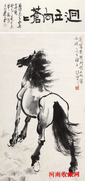 徐悲鸿《马》 纸本水墨 立轴 82×48cm。备注:萧平题诗堂,四川文物总店证书