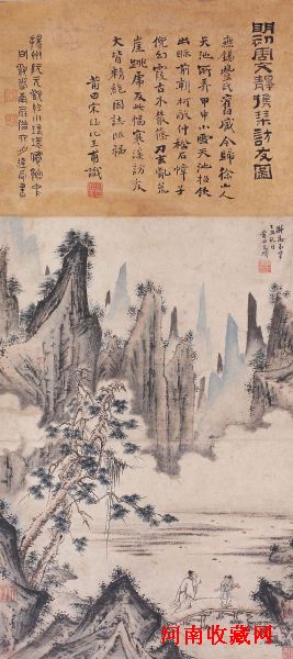 此作为明代画家周文靖《携琴访友图》, “携琴访友”是旧时绘画的传统题材,用以表达高士隐者超然世外的生活情趣。此画构图精妙,左面的棵松树与远处群山、云雾相融合,使画面整个联系在一起;中间的大面积空白与高山形成对比,疏密相宜,笔法极为细腻。人物线条勾勒流畅自然,形神兼备,功力坚深。一琴童引路,一老人相随,寻视访友,情意甚殷。《诗经》云:“伐木丁丁,鸟鸣嘤嘤。嘤其鸣矣,以求友声。”一幅携琴访友图,高山流水觅知音。