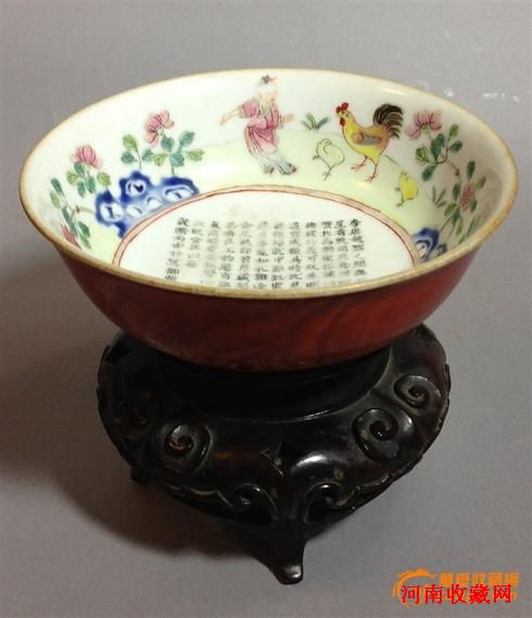 碗壁底刻书乾隆御题诗:“李唐越器人间无,赵宋官窑晨星看,殷周鼎彝世颇多,坚脆之质于焉辨,坚朴脆巧久暂分,立德践行义可玩。朱明去此弗甚遥,宣成雅具时犹见。寒芒秀采总称珍,就中鸡缸最为冠,牡丹丽日春风和,牝鸡逐队雄鸡绚,金尾铁距首昂藏,怒势如听贾昌唤,良工物态肖无遗,趋华风气随时变,我独警心在齐诗,不敢耽安兴以晏。乾隆丙申御题。”。