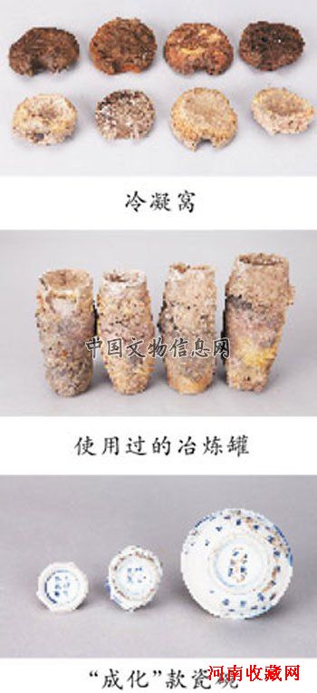 出土遗物标本共计700余件,种类有陶、瓷、铜、铁、石器等。遗物以陶质冶炼罐及其冷凝区构件之一的冷凝窝为主。完整及可复原的冶炼罐260余件,由反应室及冷凝区两部分组成。反应室为灰色夹粗砂的硬陶深腹罐,侈口、卷沿、圆唇、深腹、平底,高约30厘米。冷凝区即在罐体的肩部用黏土(耐火泥)上接一节口径约10厘米、高约6厘米的筒形物,上置铁质盖板,与罐口内放置的冷凝窝形成空腔。冷凝窝为耐火黄砂泥捏制而成,置于反应罐的口部,平面呈圆形,内凹,边缘上戳有一长方形的气道;冷凝窝用来盛接冶炼出的气态锌冷凝成的液态金属锌。