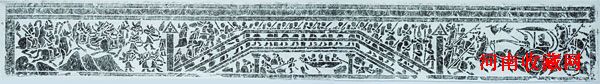 将这样一幅壮观惨烈的战争场景安排在一道两端有高柱的桥上,是非常巧妙的,因为兵士从桥上单行或双行前进,这样不仅看出军容的整肃,而且漫长有序的行列容易让人想象后面似有千军万马随之而来。同时,把两军交战的地方定于桥头之上,让汉军占领着整座桥,显示出其在气势上、地理上均占优势,即将获得胜利。画面上边有一道垂幛纹。引人注意的是,“把山和水同刻在一个画面上,这是目前所知的最早的一幅,在汉画中也是唯一的一幅。”据资料所知,山水画至隋唐之际,始独立形成画科,但由此看来,早在400余年前的东汉画像石上就已经有山水画了,此可谓“全世界第一幅山水画”。