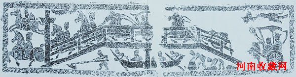胡汉战争图之三:车骑过桥(苍山县卞庄镇晒米城出土,苍山县文管所藏)。画面中心刻一大桥,桥饰栏杆,三辆轺车接连而上,车前三导骑。左上角刻一胡人骑兵,深目高鼻,头戴尖顶帽,作败退状,回首张弓欲射。桥下一舟,两人划船,船身坐两妇人。船前后刻三渔人或使扒网,或使罩网,或徒手捉鱼。