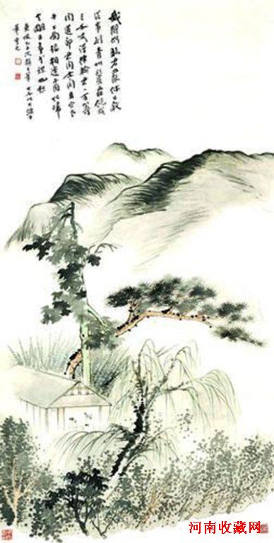 山林苍翠,一溪瀑布奔泻而下,形成深潭流水,笼罩在雾气之中,恍如仙境;山涧之中,屋舍数间,树木环绕,远山叠嶂。