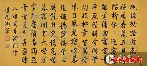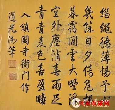道光帝爱新觉罗·旻宁39 岁即位,在位时间 30 年(1821- 1850),享年 69 岁(1782- 1850),死后称宣宗成皇帝。道光年间是清朝衰落之始,鸦片战争爆发,不平等条约签定,内外交困。而旻宁的书法却继承了盛世之风,馆阁体重而浓茂,严正而规矩,有很深的功力,看得出他的良好文化功底。日本《支那历代皇帝皇后亲王御笔书画目录》第180 页“清朝”部分,有“道光御书”一栏,其中记有“御制黑龙潭祈雨诗”,又记“横幅黄色,蜡笺纸本”,皆与本届拍卖会推出的道光帝书法横幅相似。