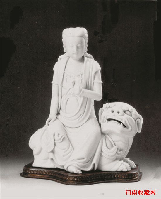 文殊菩萨常与普贤菩萨同侍释迦牟尼佛,是释迦牟尼佛所有菩萨弟子中的上首,所以又称为文殊师利法王子。文殊菩萨形象则为仗剑骑狮之像,代表着其法门的锐利,以右手执金刚宝剑,断一切众生的烦恼,以无畏的狮子吼震醒沉迷的众生,这是文殊菩萨的基本形象。除此之外,文殊菩萨相应于娑婆世界有情众生的因缘,亦有种种不同形象的示现。在佛教艺术中文殊菩萨的变化与骑狮相关联。在许多佛教寺院中人们经常可以看到这样的情景:骑着狮子的文殊菩萨与骑着大象的普贤菩萨对称出现在释迦如来佛的左右两侧,就是今天人们所说的“华严三圣”,这件瓷雕文殊菩萨(见图片,民间收藏),高25.5厘米,背部钤“博及渔人” 四方形印章,为近代史上著名的瓷雕艺术家苏学金作品。苏学金(1869年至1919年),名光铨,号蕴玉,福建省德化县龙浔镇宝美村人。其作品款识一般钤印于器物背部,少数于底部,已知有下列几种:姓名款,“苏蕴玉”、“苏蕴玉制”,方形阳文楷书。商号款,“蕴玉”方形阳文篆书。雅号款,“博及渔人”,方形阳文或阴文篆书。仿明“何朝宗”款,葫芦形阳文篆书或隶书,有时又与“博及渔人”印章出现于同一作品。地名款,“德化”葫芦形阳文篆书,或有“福建德化制造”,与仿明方形阳文楷书“大明万历年制”款一起使用。