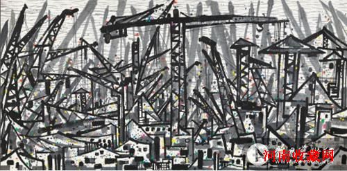 作为林风眠先生的高足,吴冠中(1919-2010)是20世纪现代中国绘画的代表性画家,终生致力于“油画民族化”及“中国画现代化”之探索。是次中国嘉德(香港)2014年春季拍卖会集中呈现了三幅吴冠中佳作。 其中巨幅创作《交臂》煌煌巨制,为近年市场罕见。此作脱胎自画家1984年在“葛洲坝”的写生稿。吴冠中自己曾说:“依据此稿作大幅墨彩,破我旧格局”。此幅格局之大,气象万千。吴冠中在本幅中完全没有运用“吴氏山水”招牌式的繁密曲线,取而代之的则是布满全纸的直线、斜线、并行线。简练而粗重、颇具爆发力的黑色线条是鳞次栉比的高耸吊臂的最佳载体,在表现支架牵引的较细线条的衬托下更显露出一种浑厚肃穆、刚劲有力的美感。