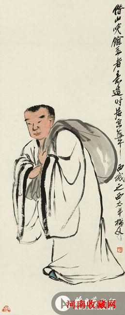 齐白石的人物画并非是他整体创作中数量最多或是最具代表性的题材。然而,齐白石以人物为题材的作品却具含了丰富的内在意义,并与其绘画、生活历程紧密连接。如果说齐白石的花鸟作品是其艺术成就的典型代表的话,那么,他的人物画则可以说是其作品“民间味”意涵的具体呈现。本幅《布袋和尚》中,画家以非常生活化、现实化的眼光描写了身着宽大僧袍、肩背口袋、顶上微蓄头发的普通僧人的形象。图中僧人形神兼备,皮肤略施赭色,衣纹简劲流利,用线一气呵成。《布袋和尚》为日本著名收藏家须磨弥吉郎旧藏。