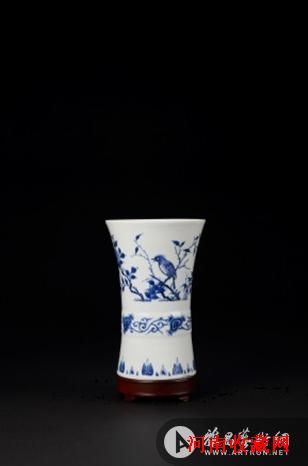 撇口,束颈直腹,撇足,下腹突出一道装饰带,形制类似花觚而有不同,细砂平底,无旋纹跳刀痕,底心略内凹。暗刻卷草纹装饰带分别辅予口沿一道,腹部两道。青花发色翠兰,图案分三道装饰,上部绘制枝头花鸟,画法明显受到明末清初画家朱耷的影响,小鸟生动传神,枝蔓错落有致。下腹饰有灵芝卷草纹,近足处绘有火焰纹。此件胎土白洁细致,器形秀雅,用于花插养神修心。
