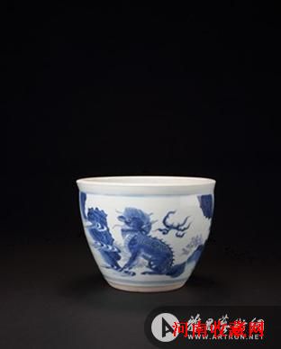 明崇祯,青花麒麟大象纹卷缸,H:15.5cm