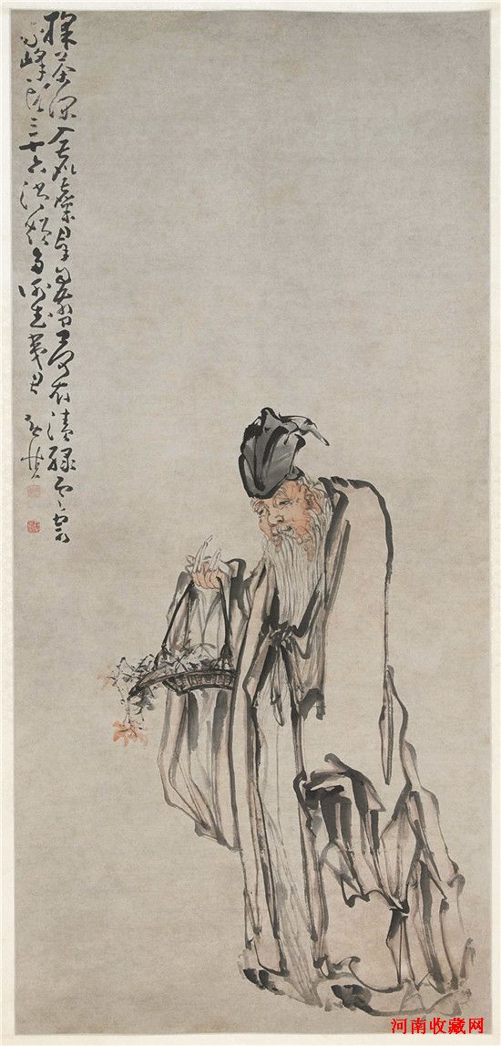 烟台市博物馆所藏的这幅《清黄慎采茶翁图轴》为纸本、设色,纵137.1厘米,横64厘米。图中绘一身着曳地白衫,头戴黑色方巾,白髯垂胸的老翁,手提采满山茶的竹篮,神态自然、缓步而归的情景。此作当为黄慎中晚期用狂草笔法作画的典型作品,整幅画面以狂草笔法写意,采茶翁的身体从肩颈部到腰部以下用一根线条连笔勾出,从颈部落笔,稍按即提,形成线条的一个转折,徐行至肩部再提,线条圆转,然后放笔疾行至臂弯处和腰部,线条几乎在飞舞,线条的墨色也随着运笔力度和速度变化而产生了虚实、起伏、粗细以及浓淡的变化,转折的变化与人体结构特征基本一致。从绘画效果上看,草书描线条不仅表现了衣纹的变化,还把处于动态中的人物形体结构也表现得相对较为细致,使人物更加生动传神,耐人寻味。画面左上方以草书题七言诗一首:“采茶深入鹿糜群,自剪荷衣渍绿云,寄我峰头三十六,消烦多谢武夷君。”诗中有画,画中有诗,诗画相融,引人遐想。后面草书款署“黄慎”,下钤一朱文篆书“黄慎”,一白文篆书“恭寿”两方印记。题诗以渴笔狂草,犹如枯藤盘结,与画面十分协调,富有节奏感。
