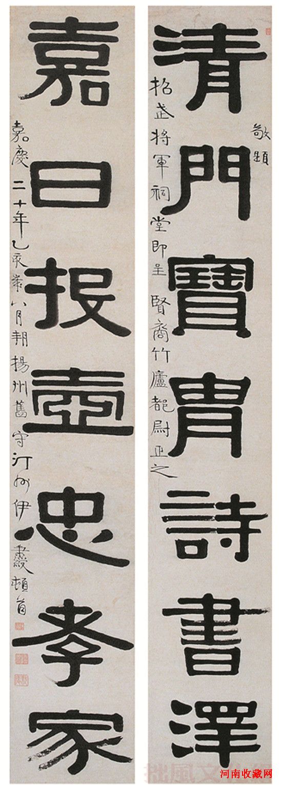 伊秉绶(1754-1815年),字组似,号墨卿,晚年又号默庵,乃先禄卿伊朝栋的长子,福建汀州府宁化县人,后人亦称其为伊汀州。乾隆五十四年(1790年)登进士,历任刑部主事、惠州及扬州知府,享有誉名。其文艺幼承家学,后随乡贤名儒攻修宋理学。平生爱好广泛,诗文、金石、书画无所不能,尤于隶书用心最多。早年隶书深受金石学名家桂馥之影响,擅长小字。又得书法名家刘石庵教诲,书艺大进。他取法汉隶,对《西狭颂》《张迁碑》《裴岑纪功碑》《封龙山颂》诸碑,深入研习,领悟要旨,并获得启发,最终成就了他浑穆雄厚的书风。伊秉绶的古穆格调构成了清代隶书成就的最高峰,包世臣《艺舟双楫》将伊秉绶的隶书推上至尊的地位;康有为《广艺舟双楫》则称他为:“启碑法之门,开山作祖”。把伊秉绶与邓石如并称为清代碑学的两大开山鼻祖。