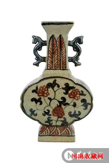 据张加好介绍,此件元青花釉里红螭虎耳方口扁为大元至正八年制,是迄今发现带有明确纪年款的元代第一件青花釉里红重器。它器形独特,端庄秀雅,胎体饰以天青釉,底足火石红特征明显,饰以双螭虎耳牡丹纹。为光绪帝书法侍教彭述之子、上海大收藏家彭水若收藏。