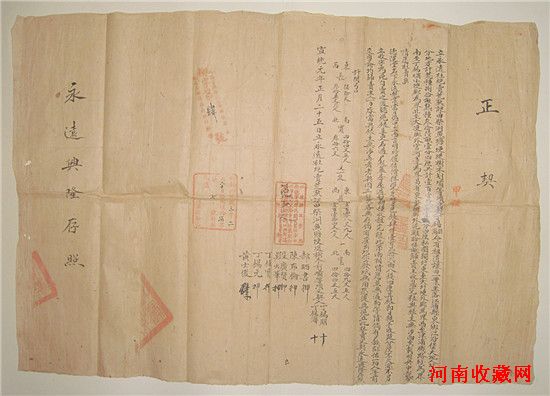 图一:正契。长65厘米,宽44厘米。正契实质上给业户(即买主)的税契收执,是收缴田产买卖税的一种契约。一般先由买卖双方自行协商,书写买空卖空地契,然后由官府进行验核。