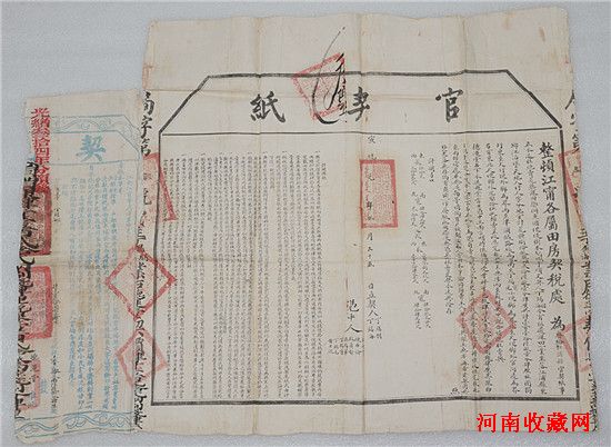 图二:官契纸和契尾。粘贴在一起,长73厘米,宽57.5厘米。清代中晚期实行粘连契尾的方式,即由布政司统一刊印契尾,编号发行,粘连在民写地契之后,作为官府验契凭证。民间买用官契纸,应即同时投税。如非投税,不得买用官契纸。