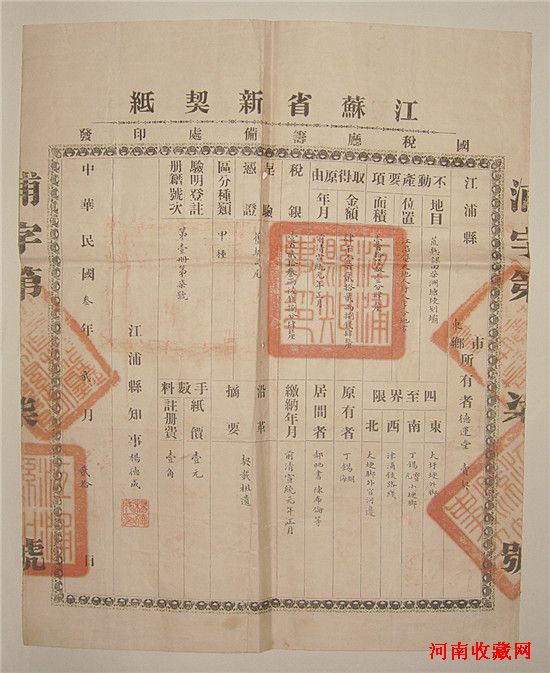 图三:江苏省新契纸。长34.2厘米,宽27.8厘米,由江苏省国税厅筹备处印发。1913年1月10日,袁世凯批准了财政部拟定的成立国税厅筹备处章程,由国税厅筹备处“掌监督及执行关于国税事务”,并陆续任命了各省的国税厅筹备处处长。国税厅的设立,就是要由中央直接经管原由地方征收的国家税,把财权收归中央。在税目的划分上,将契税等十七种重要税目列为国家税。各省国税厅筹备处于1913年底相继成立。