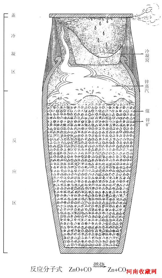 第六步是蒸馏。用火点燃柴薪,然后引燃煤饼,当反应罐内温度达到还原程度的时候,锌矿与煤(炭)发生化学反应(ZnO+CO→Zn+CO2),还原出气态锌,锌蒸汽通过冷凝窝的通气孔上升,至冷凝区冷却,便可制得纯净的金属锌结晶。