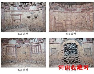 M1是一座仿木结构砖室墓,墓向南。平面略呈方形,边长2.5米,自墓四直壁上部逐渐内收为攒尖顶,总高约3米。由于人为破坏,仅存墓葬的甬道西壁、墓室西、北两壁及部分墓顶。根据现场调查,墓室仿木结构,直壁上部砖砌斗拱建筑图案,墓室的转角处砌有倚柱,并绘朱色底菱形墨线图案。墓室直壁部分先在其上涂刷白灰,然后绘壁画。该墓破坏严重,葬具、尸骨及随葬器物情况不明。