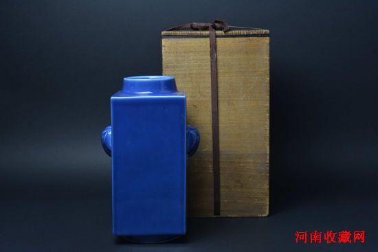 此件光绪朝祭蓝釉象耳四方瓶即为当时的仿古之作,祭蓝釉被誉为宝石蓝,与霁红、甜白同被列为上品,象耳方瓶是清代官窑的传统品种,有“太平有象”的寓意,从乾隆朝开始流行,历代均有烧造。此瓶圆口方身,仿玉琮制式,腹上部两侧贴饰双象形耳,底书“大清光绪年制” 六字三行篆书款。整体造型周正严谨,线条利落简洁,古意盎然,且釉色纯正,蓝如深海,晶莹亮泽,釉面不流不裂,色调浓淡均匀,殊为仿古佳器。