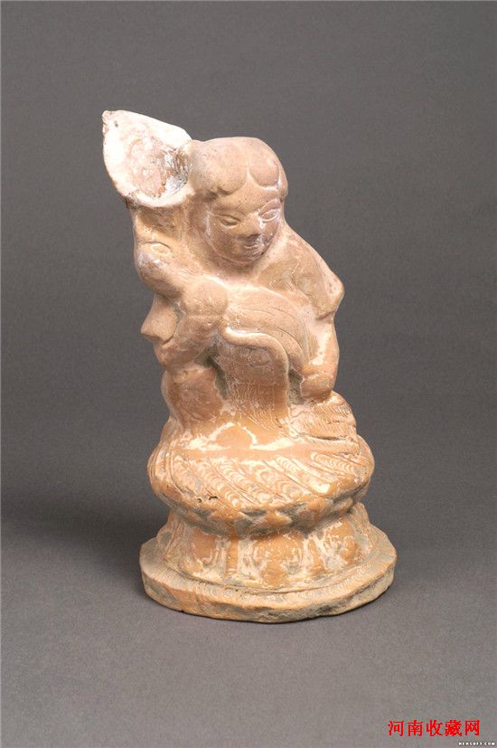 武威市博物馆藏有一对唐代童子填鸭陶俑(原名抱鸟童子陶俑),1997年甘肃武威高坝二队唐墓出土。其造型为童子抱鸭跪坐于束腰圆形台座上,泥质红陶,通高29厘米,童子肩宽12厘米,底座直径14.5厘米。童子右腿跪坐,左腿曲立,怀抱一鸭,左臂环抱鸭颈,右臂抱鸭尾,身体前倾,头紧贴鸭的颈部,迫使鸭保持头部上扬。童子微低首,唇紧闭,紧抱鸭子。鸭嘴大张,作奋力挣扎状。一漏斗形器插在鸭的嘴中。作品通体施白彩和粉红色彩。这种造型的陶俑在该馆的藏品中是唯一的,在国内出土的同类陪葬俑中也很少见。这两件藏品大小、样式几乎一模一样,且保存完好。童子圆脸,发髻中分顺着额头向鬃角两边梳成圆弧状,人物造型丰满;鸭子挣脱束缚的左翅、身上的纹路、大睁的眼睛都表现的栩栩如生,是典型的唐代雕塑。同时出土的还有二十多件唐三彩,有镇墓兽、人物俑、骆驼俑等。