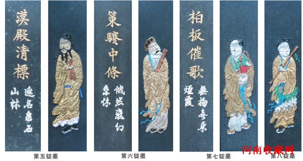 第七锭墨正面楷书阴刻描金是“拍板催歌”,背面是蓝采和的形象。