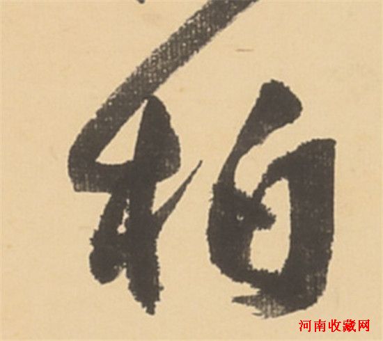 纸张吸收水墨是毛细管现像(capillary phenomena),速率视毛孔大小(pore size)和纸、墨、空气三界面间的表面张力(surface tension),墨初触纸时吸收最快,逐渐减慢,有如煞车减速,原理在百年前已大致明白(Washburn equation),早经实验一再证明,简单解释是水墨本身有流动阻力,纸内水墨愈多阻力愈大,流动也就愈慢了。重点是若用相同的纸墨,就有相同的吸收速率特性,行笔起落有轻重快慢节奏,墨色就产生“自然”变化,慢笔时纸吸墨多,快时吸墨少,因而行笔转折按提的迅时动态可由墨色变化观察,一般书法作品不须用透视方法亦可见。图2是叶恭绰(1881-1968)《行书王安石咏竹诗》中一个“柏”字,拖笔起首处墨薄可见纸纹,转折慢行即变厚,左旁“木”字按笔处更慢,薄纸吸墨至饱和而散化,右旁“白”字末横钩上提再下点也见轻重浓淡分明,书写精神动作通过墨彩表现,栩栩如生,此所谓“神彩”。