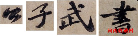 图3四字取自《题王诜诗帖》精细图像,数年前得北京故宫提供,只要把计算机显示屏亮度和视线角度调正,“公”字一笔内墨色层次也可以看到,另三字笔间字间深浅变化更容易识别,但在故宫出版的画册中则不易辨,深浅色泽层次失准是画册一大弱点,影像多经一重处理程序就多一分失真,印刷品光暗比例(contrasst ratio)大约只到百比一,摄影机和显示屏则可到千比一,但仍不如人眼灵敏。在阳光下拍照,人面上阴影在打印照片中乌黑不辨,但当场眼看清晰,就是此故。