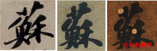 图4左方“苏”字亦取自《题王诜诗帖》,右上角短撇尽处提笔墨薄可见纸纹,“禾”部末笔作长点回收,两端墨色稍薄于收笔余墨处。字内各笔亦有深浅差别,例如“鱼”部细笔长划色泽最淡,粗撇由浓变淡。同图中、右是北京招待会发布的《功甫帖》“苏”字图像,摄影机性能比故宫更高,但同大正影和透视都难察一笔内变化,且全文九字一律深黑,显示吸墨饱满,却又甚少散化,明白上述科学原理就知道书写时速度必又稳又慢,笔亦小心保持狭窄干湿范围。幼时摹帖学字就是这样,为求形似,必逐笔缓写,每笔只蘸一点墨,不干不化,用透光照视也没多少墨色变化,苏轼行书可会有此写法?
