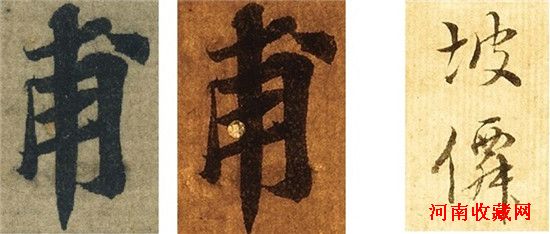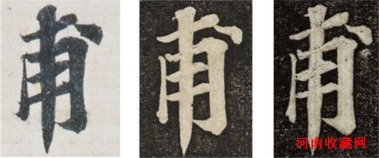 图11“甫”字,左为拍品,中为《安刻》,右为许汉卿题识所言“杨惺吾(守敬,1839-1915)先生刻本”,即《景苏园帖》,初成于1892年。此字四横三直一点,拍品与《安刻》无一笔对:图左拍品首横落笔角度不同拓本,略呈上翘,次横粗而封角,第三横上斜和收笔角度不同,第四横左首穿出,收笔见锋,左竖落笔细,右竖外侧弧度强,横钩角度有别,中央悬针起首不似,末点全不见曲。此字每笔形状简单,拍品八笔无一与《安刻》合乎正常刻拓误差,不可能为鲍藏母本,所以这关通不过,链也断了。作为摹本,拍品误差之大也不能识别所用拓本为何,两拓本间差别少于与拍品差别,非常明显,由此也可了解刻拓的精准程度。