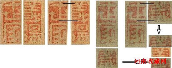 五、另两方残印在左右纸边,真伪亦有所争论,但一致认同两半印源出一印,合并可略辨印文为“图耤”二字。奇怪的是两半印都钤歪,图8中把印扭转7°才见四边平正,书画钤印略歪一两度很普遍,例如图7中“义阳”半印歪2°“世家”半印歪1°,这是正常的范围,但鲜见有歪至7°的,前后两次斜度相同就更不寻常了,同歪7°而完全对合的两半印有多少他例?北京招待会发布图像提供了一些线索:
