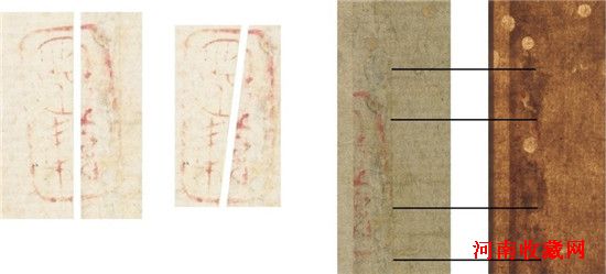 图8透视影像见帖左缘半印部位上、中、下三处亮度特暗,显示加了补纸补浆,或落浆糊特重,正影图像隐约见一垂直细线有如接纸缝,右方横纸纹至此线而止,线左纸纹难辨。最简单的解释是做伪者所用旧纸右方原有全印,割去一半移接到左边,只在割口损失一狭条。当然一切全属偶合亦有可能,但可能性会有多少?一千个骑缝印有几个会打歪7°?何况连续两次斜度相同、两半完全对合而无半分重迭?这种古怪的反常现象往往是做伪者故意留下的标记,如无特别原因,不能轻信。