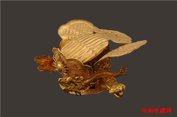 这顶金冠上有双龙戏珠的造型,目前考古所见,仅有北京明十三陵中定陵出土的一顶金翼善冠和两顶乌纱翼善冠与之相似。定陵出土的金翼善冠,主冠体呈半圆球形,称为前屋,后部隆起,称为后山。后山外部两折角向上,正面嵌双龙戏珠图案。图案上的双龙,昂首相对,雄猛威严,有着强烈的艺术装饰效果,体现了封建帝王神圣的权利和至高无上的地位,成为皇权的象征。