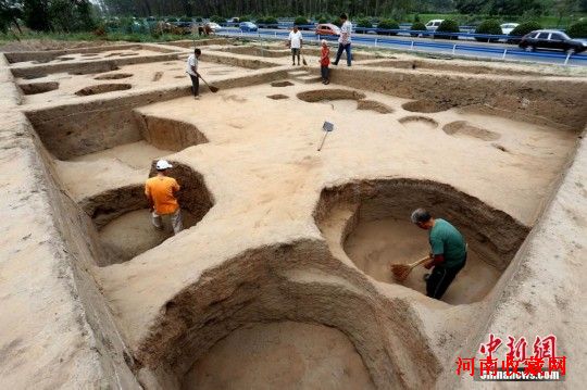 近日,一处距今6000至5000年之间的仰韶文化晚期聚落遗址在郑州市七里河畔被成功发掘。该遗址东西长300米,南北长400米,总面积12万平方米。外围有环壕,内有居住区、生活区、墓葬区三大区域。通过发掘发现了房基3处,灶台3个, 墓葬39处,灰坑140个, 瓮棺葬2处,出土大量陶器、蚌屑、石器和骨器等生活生产用具。